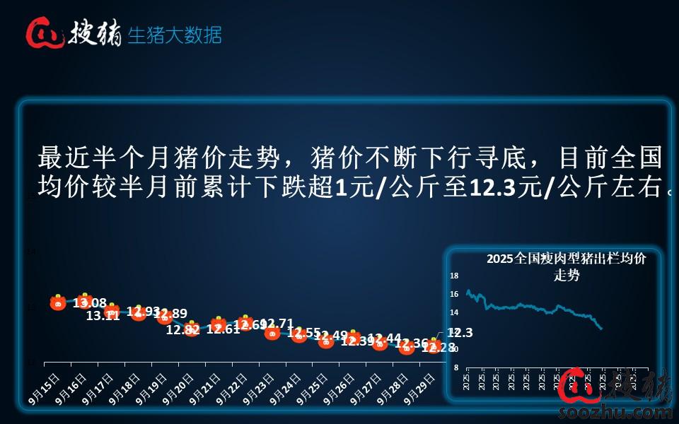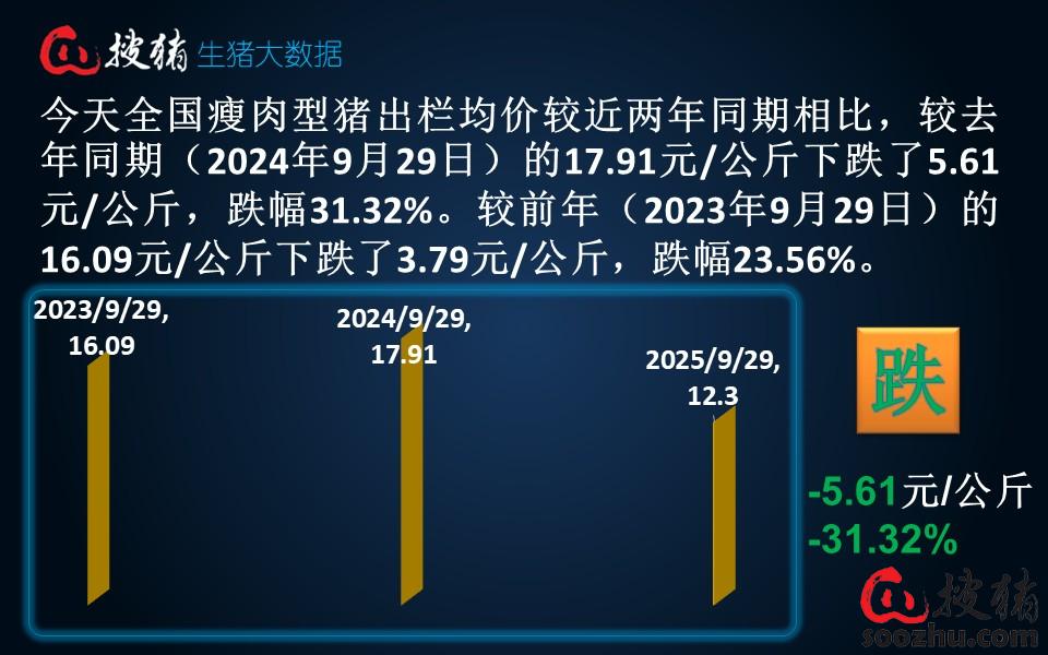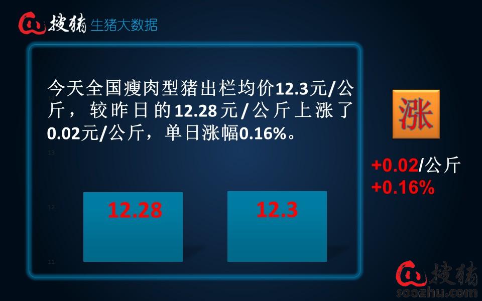 今日全国瘦肉型猪出栏均价12.3元/公斤,较昨日的12.8元/公斤上涨了0.02元/公斤,单日涨幅0.16%;较去年同期的17.91元/公斤下跌了5.61元/公斤,同比跌幅31.32%。