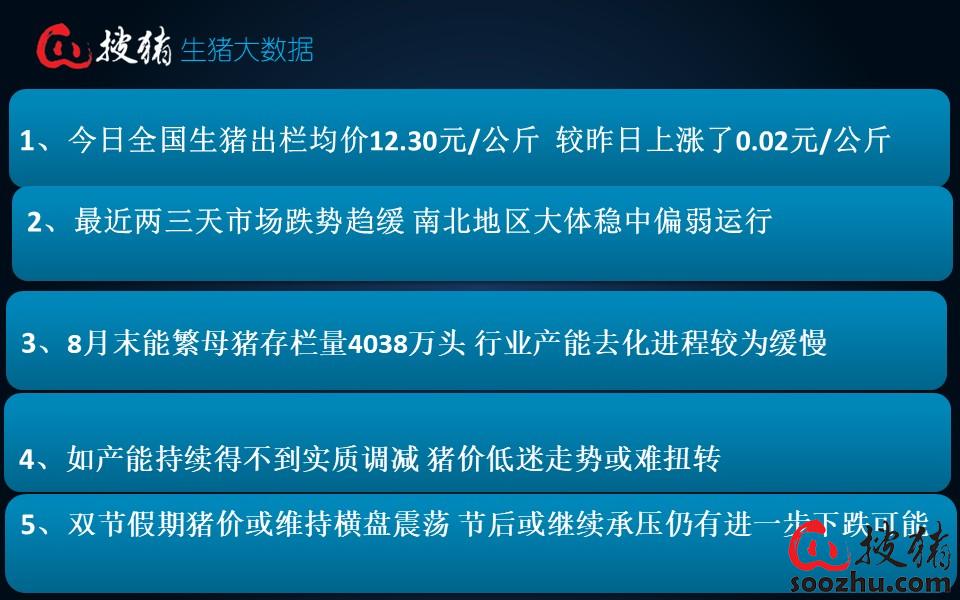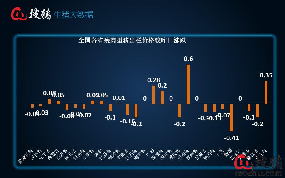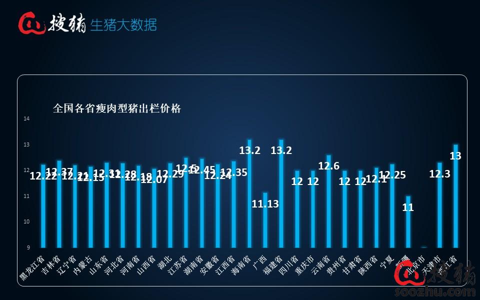 最近两三天市场跌势趋缓,全国均价于12.3元/公斤附近保持弱势稳定局面,南北地区大体稳中偏弱运行。今日全国市场中,仍有15省猪价较昨日保持上涨态势,2省猪价与昨日持平,其他11省猪价微幅上涨。目前广东、浙江、福建和海南4个高价省猪价稳定在13.2元/公斤左右,新疆和广西2个最低价区猪价跌至11元/公斤左右,除此之外,四川、重庆、贵州、甘肃及陕西等地猪价也即将失守12元/公斤大关,其余地区主流报价在12-12.5元/公斤。