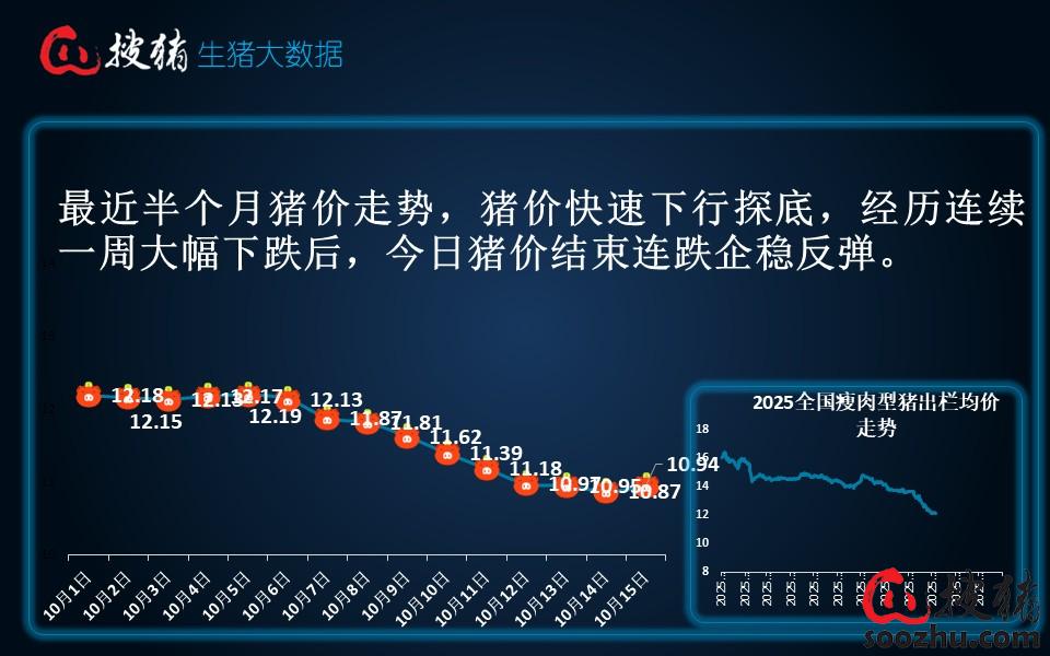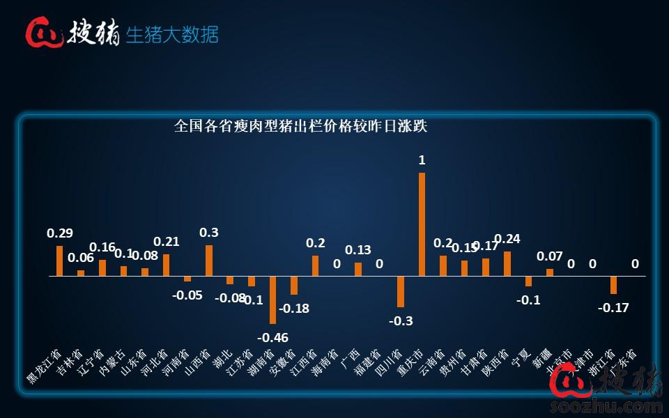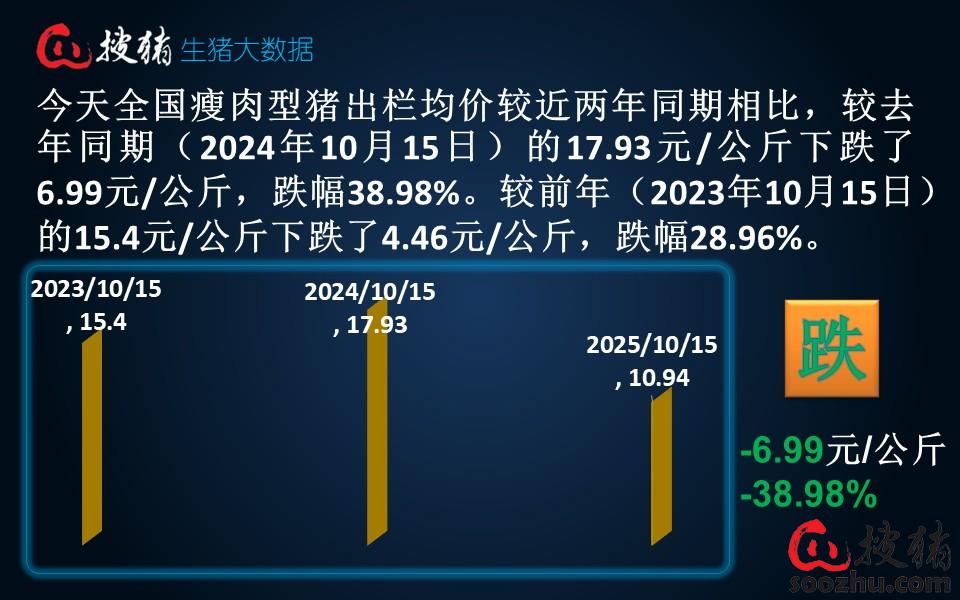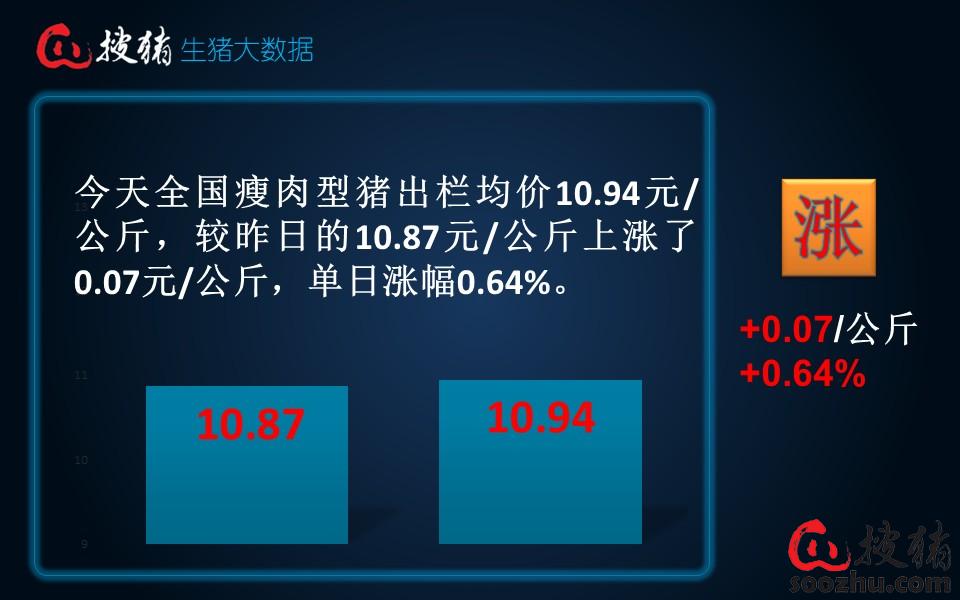 今日全国瘦肉型猪出栏均价10.94元/公斤,较昨日的10.87元/公斤上涨了0.07元/公斤,单日涨幅0.64%;较去年同期的17.93元/公斤下跌了6.99元/公斤,同比跌幅38.98%。
