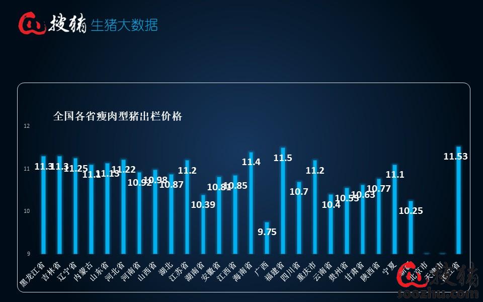 今日生猪价格结束了十天连跌局面出现小幅反弹,从南北各地报价情况来看,除华中、华北及西南部分养猪大省外,其余大部地区生猪报价较昨日出现了0.05-0.25元/公斤左右的上涨。截止到目前全国有15省猪价处于11.1-11.5元/公斤区间,主要集中在华南及东北地区,其余近一般省份猪价维持在10.4-10.9元/公斤,最低价的广西猪价连续三天保持在9.6-9.7元/公斤低价区间,整体价差普遍不及0.5元/公斤,南北区域间价格差异十分有限。