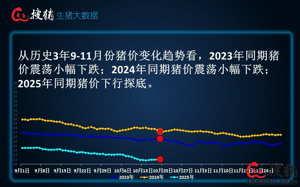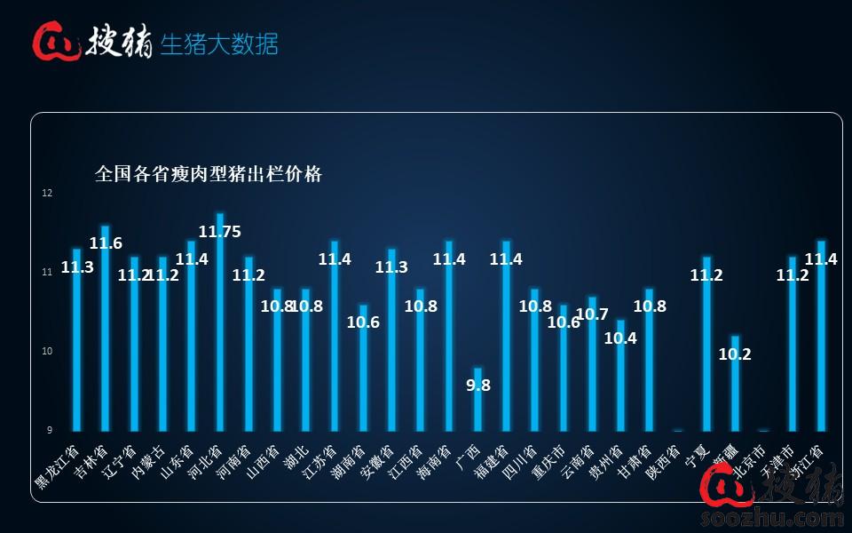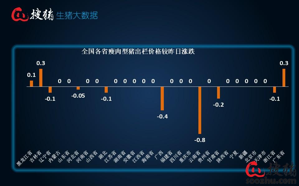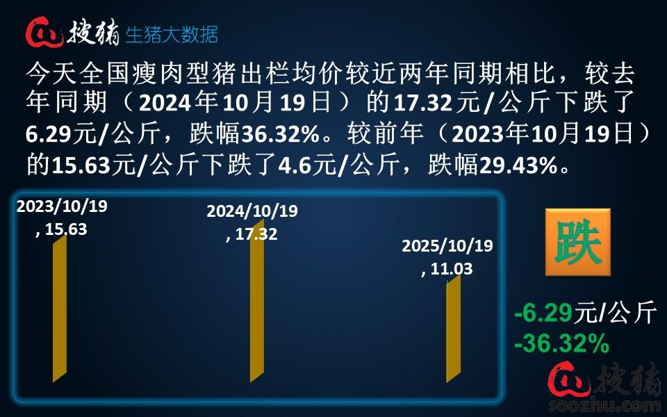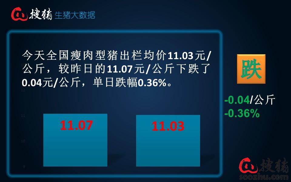 今日全国瘦肉型猪出栏均价11.03元/公斤,较昨日的11.07元/公斤下跌了0.04元/公斤,单日跌幅0.36%;较去年同期的17.32元/公斤下跌了6.29元/公斤,同比跌幅36.32%。
