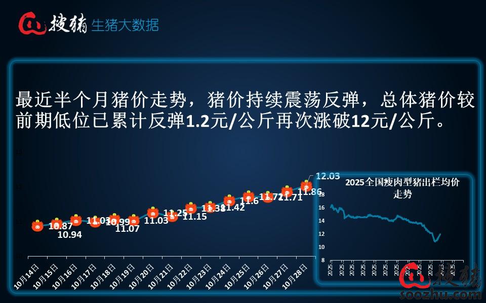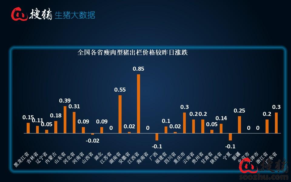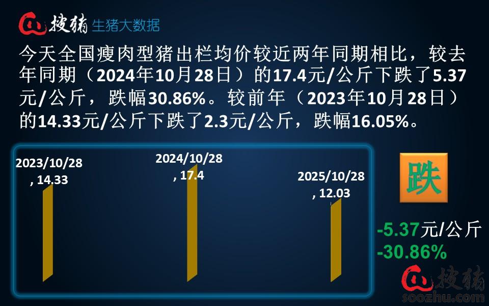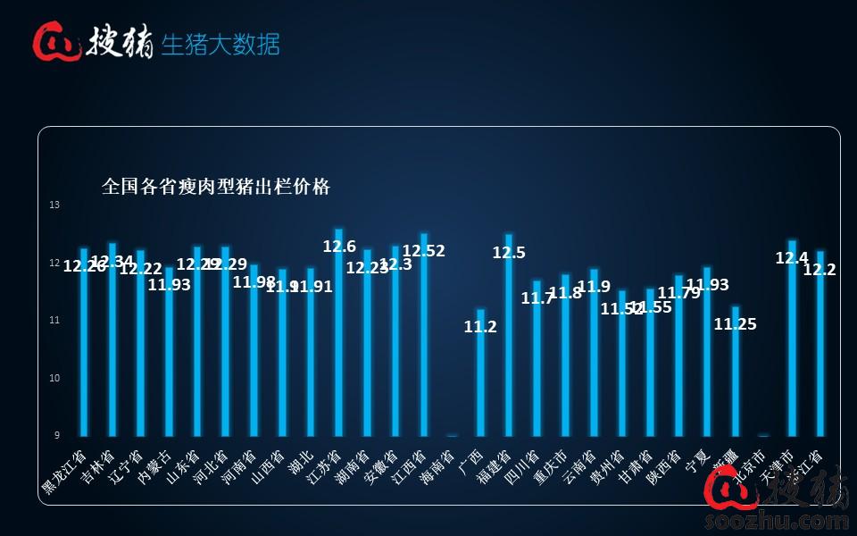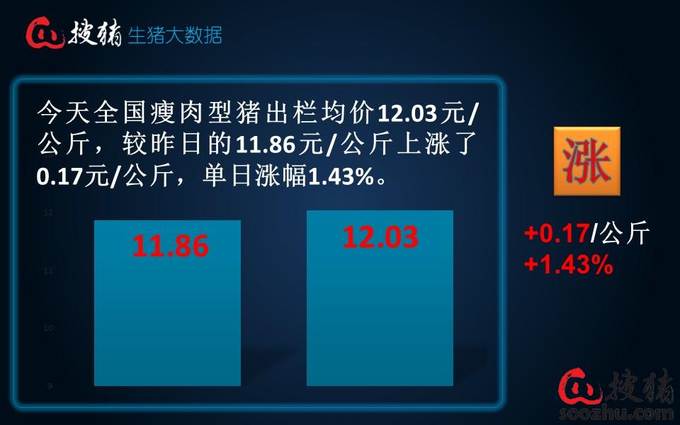 今日全国瘦肉型猪出栏均价12.03元/公斤,较昨日的11.86元/公斤上涨了0.17元/公斤,单日涨幅1.43%;较去年同期的17.4元/公斤下跌了5.37元/公斤,同比跌幅30.86%。