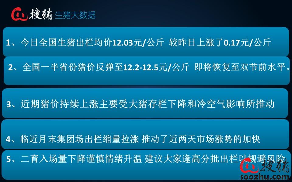 今日全国大部生猪报价单日上涨了0.2-0.3元/公斤,南方局部地区依旧呈现明显的跟涨表现。总体来看,最近两天生猪市场涨幅加大,至此全国均价已回涨冲破12元/公斤,目前全国有一半省份生猪均价反弹至12.2-12.5元/公斤,较前期低点出现显著回升,即将恢复至双节前水平。