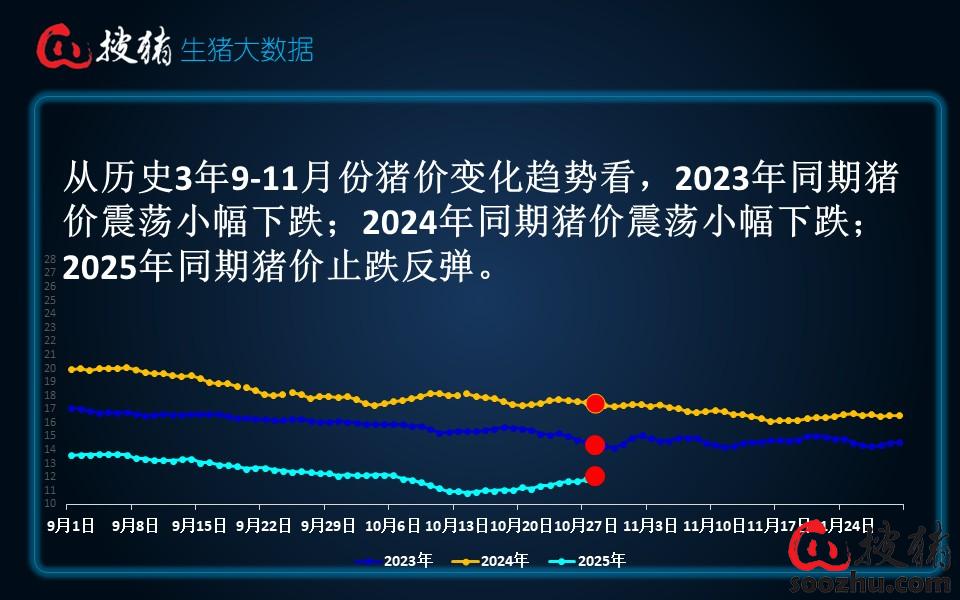 近期猪价持续上涨主要受大猪存栏下降和冷空气影响所推动,由于养殖端持续降重出栏及禁止二次育肥政策导致现阶段市场大猪存栏快速下降,而气温转凉后居民猪肉消费偏好转向厚膘肥肉,支撑了大中猪价格上涨,大猪价格走强带动二育及压栏增重积极性,拉动了市场标猪跟涨。另外在寒潮天气带动下,猪肉消费需求呈现季节性回升,下游白条走货量较前期增加,对猪价上涨起到了助推作用,而最近两天临近月末集团场出栏缩量拉涨,进一步推动了市场涨势的加快。