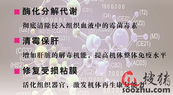 霉毒清的作用机理2:催化分解霉菌的基因排列,大大降低分泌物霉菌毒素的排出量。
