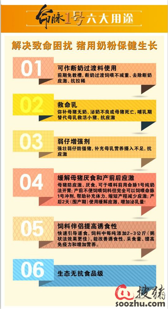 母猪在产后至小猪断奶前,仍然在承受着因生产而带来的应激(虽然是个逐渐减轻的过程);尤其产后2天间的状况对母性表现、泌奶、哺乳和自身免疫防线恢复关联密切。命脉1号奶粉还将派上用场,起到良好的效果。纯奶法(冲剂)和粥拌法饲喂可以同时或交替进行。